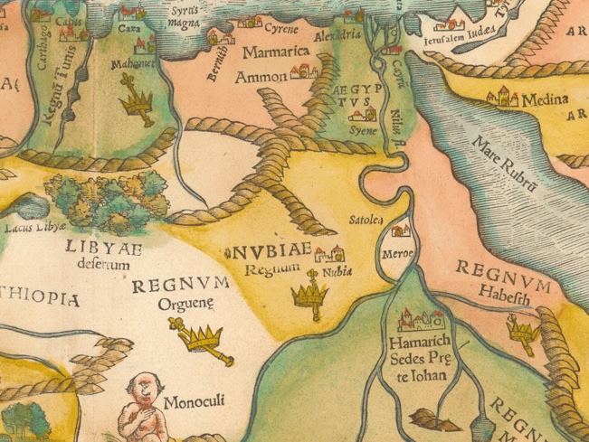 A 16th-century map of Africa by German cartographer Sebastian Münster, depicting “NVBIÆ Regnum” (Kingdom of Nubia), in the approximate location of modern northern Sudan. Source: Princeton University