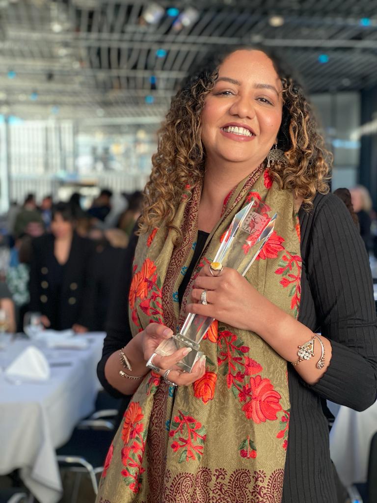Sara Suliman holds the Audience Award for her film, Heroic Bodies, at the Malmö Arab Film Festival (MAFF) 2023
