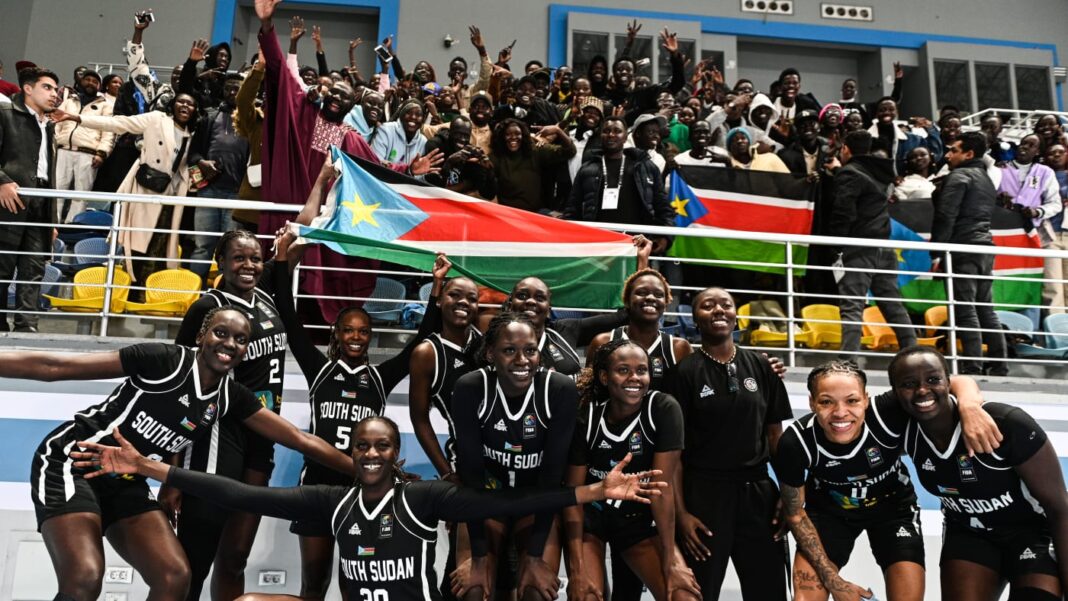In this picture, every face radiates pure joy and pride, with the flags waving high as a sign of victory, reflecting South Sudan women’s basketball team’s magical performance in the FIBA Women’s AfroBasket 2025 Qualifiers. Competing in Zone 5, the team secured a remarkable victory against Kenya for the second time, winning 80-63 on 8 February 2025 at the Hassan Moustafa Sports Hall in Cairo, Egypt.
